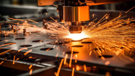 Laser cutting creates sparks in metal, industrial machinery stock images ai, midjourney prompt ideas