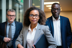 woman glasses holding file office people business men professional female job hiring interview hyperrealistic hd office corporate team members diversity work standing workplace career collaboration colleagues team office environment interacting documentsImagine Buddy