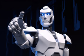 white robot pointing saying hey friendly artificial intelligence ai technology future automation hyperrealistic hd attention interaction innovation gesture curiosity communication engage digital cute unseen science fiction object machine futuristic vocalize expression concept greeting humanoidImagine Buddy