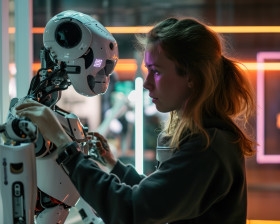 woman works robot exhibit technology futuristic collaboration artificial intelligence ai future automation hyperrealistic hd interaction experience robotic innovation advancement experiment partnership scientific digital interactive display showcase contemporary explore modern futuristic technology humanImagine Buddy