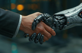 A businessman shakes hands with a robotic hand in a symbolic gesture of collaboration