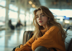 attractive young woman airport sitting carrying luggage public transport travel transportation hyperrealistic hd holiday traveler trip airport lounge passenger baggage explore adventure vacation lifestyle waiting casual journey suitcase departureImagine Buddy