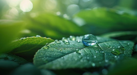 Clear water droplet rests on a green leaf, water conservation image