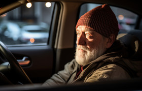 An elderly man sits in his car stuck in traffic, public transport city picture