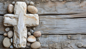white stone cross feather pebbles wood background peace harmony nature tranquility palm sunday hyperrealistic hd faith belief simplicity serenity decorative balance decor symbol spiritual religion texture art mindfulness calm meditationImagine Buddy