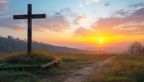 cross meadow autumn sunrise background nature peace spirituality symbol serene palm sunday hyperrealistic hd tranquil outdoor religious picturesque symbolize landscape countryside field faith morning worship belief seasonal beauty backdrop harmony sceneImagine Buddy