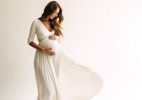 A pregnant woman is standing in front of a white background, pregnant women pictures, maternity photos