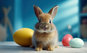 rabbit ball blue background cute adorable playing fun easter easter day celebrate hyperrealistic hd pet furry fluffy activity lively happiness amusement joy entertainment small playful color vibrant animal isolated domestic leisure energeticImagine Buddy