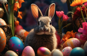Bunny rests on grass surrounded by vibrant easter eggs in the background, easter bunny image