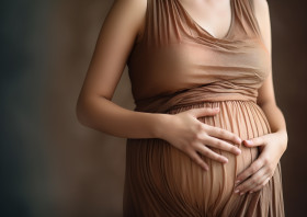 A pregnant woman is holding her belly and wearing a brown dress, pregnant women pictures, maternity photos