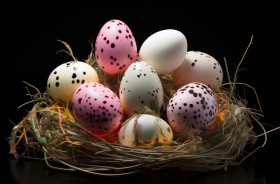 A cluster of eggs in shades of colorful resting on a bed of straw, easter nests photo