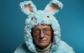 Elderly person in bunny hat posing against blue backdrop, easter fashion concept