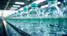 Many water bottles aligned on a factory production line, water in industry picture