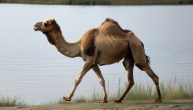 A graceful camel walks calmly by the water, camel photo