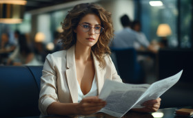 working professional girl glasses office laptop document paperwork file hyperrealistic hd career concentration technology business analysis corporate indoors study woman workplace review young job sitting desk work occupation focused employeeImagine Buddy