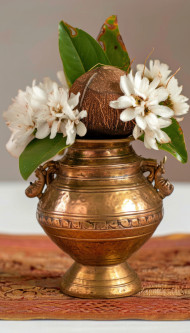 Closeup of kalasha symbolizing prosperity with a brass pot and coconut, gudi padwa decoration concept