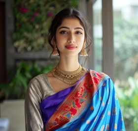 Woman in wearing a colorful marathi sari, gudi padwa traditional clothing picture