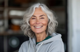 senior woman beautiful smile gray hoodie plain background happiness cheerful joy fashion style stylish clothing hyperrealistic hd content relaxed casual wear serene wellbeing elderly fashion elderly aged lifestyle peaceful senior citizen retirement casual portrait positiveImagine Buddy