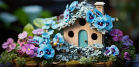 A charming fairy dwelling sits beside enchanting purple pansies, cottage downsizing concept