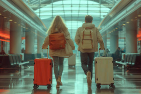 man woman suitcases running airport missed flights couple rushing late travel hurry departure blooper mistake fails hyperrealistic hd transportation stress vacation adventure frantic departure gate trip backpack delay hustle journey suitcase tourism hurry up terminal urgencyImagine Buddy