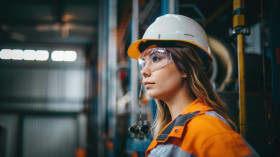A female engineer wearing safety glasses and a helmet works in a