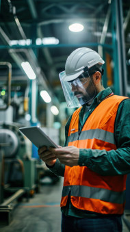worker industrial tablet safety gear screen technology manufacturing ideas intently factory equipment control machinery industry safety standards workplace automation industrial process tablet use safety gear digital industrial safety professional industrial environment worker technology focus engineer device process engineering uniform industrial setting factory worker work equipment use production industrial technology industrial worker worker safety safety protocols monitoring innovation technology use hard hat safety equipment manufacturing plant protective tech occupationalImagine Buddy