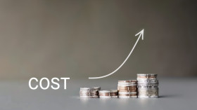 A stack of coins with an arrow pointing up and the text cost symbolizing financial growth and cost management