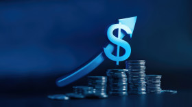 A blue glowing arrow pointing upward with stacks of coins and dollar sign on dark background symbolizing financial growth and wealth accumulation