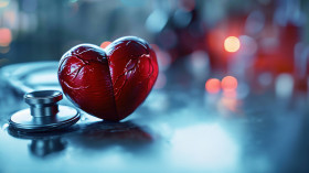 3d rendering of a red heart and stethoscope placed on table with a blurred background of healthcare and medical concepts