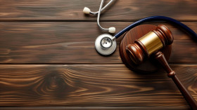 A stethoscope and a gavel are placed on a wooden table symbolizing healthcare and legal concepts