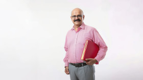 Indian male teacher in pink shirt and grey pants, holding books against white background celebrating teachers day, educator, books