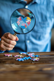 A man holding a magnifying glass examining colorful puzzle pieces shaped like a heart on a wooden table symbolizing attention to heart health, world heart day, puzzle heart
