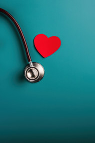 Stethoscope and dark red heart on a blue background emphasizing heart health, world heart day, medical heart