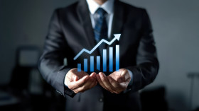 Businessman holding growth graph icon illustrating sales performance improvement, financial success concept, business growth