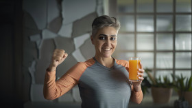 Indian woman with short hair holding up her fist smiling while drinking orange juice, enjoying a refreshing drink, empowerment, health, orange juice