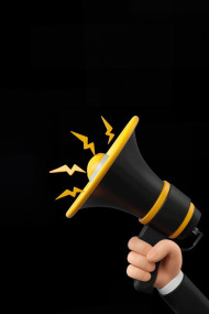 3d cartoon man hand holding megaphone with yellow lightning bolts coming out on black background symbolizing black friday sales, promotional announcements, black friday