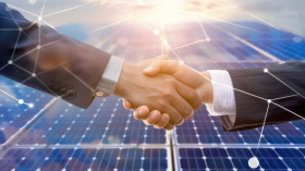 Two businesspeople shaking hands with solar panels in the background, partnership for renewable energy, collaboration on sustainable projects