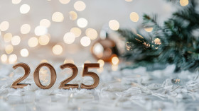 Bronze 2025 text on a white background with bokeh lights, celebrating new year or christmas