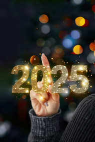 Woman hand pointing to the golden 2025 on a black background celebrating new year