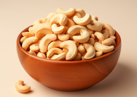 A wooden bowl filled with freshly chopped cashews, cashew image