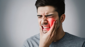 An indian man suffering from tooth pain holding his cheek against a gray background