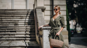 olive green linen dress sunglasses straw bag woman walking streets italy fashion lifestyle chic summer style modern casual appearance youthful relaxed portrait dynamic contemporary elegant vibrant accessory high end confidentImagine Buddy