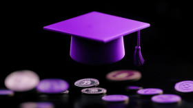 Purple graduation cap icon floating on black background symbolizing educational achievement