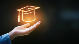 Hand holding an education cap icon symbolizing learning and technology