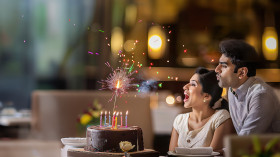 Man blowing out candles on his wife birthday cake in an elegant restaurant