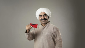 indian farmer credit card red pointing gray background digital payment engagement secure transaction finance technology electronic banking funds account management use application modern customer reviewImagine Buddy