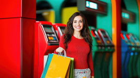 An indian woman with shopping bags standing in front of a cluster of atms atm service theme