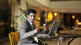 indian businessman credit card laptop table hotel lounge financial transactions managing business working digital payment finance secure funds technology electronic account management use application modernImagine Buddy