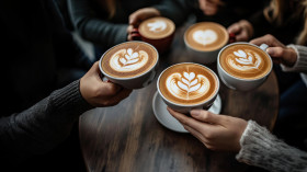 A group of friends sitting around an urban cafe table sharing coffee cups with intricate latte art