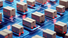 Cardboard boxes stacked on digital platforms showing logistics operations